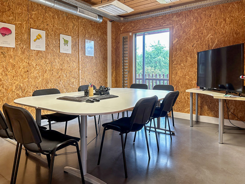 Salle de réunion de 8 personnes maximum avec écran 55’’ et accès WiFi.